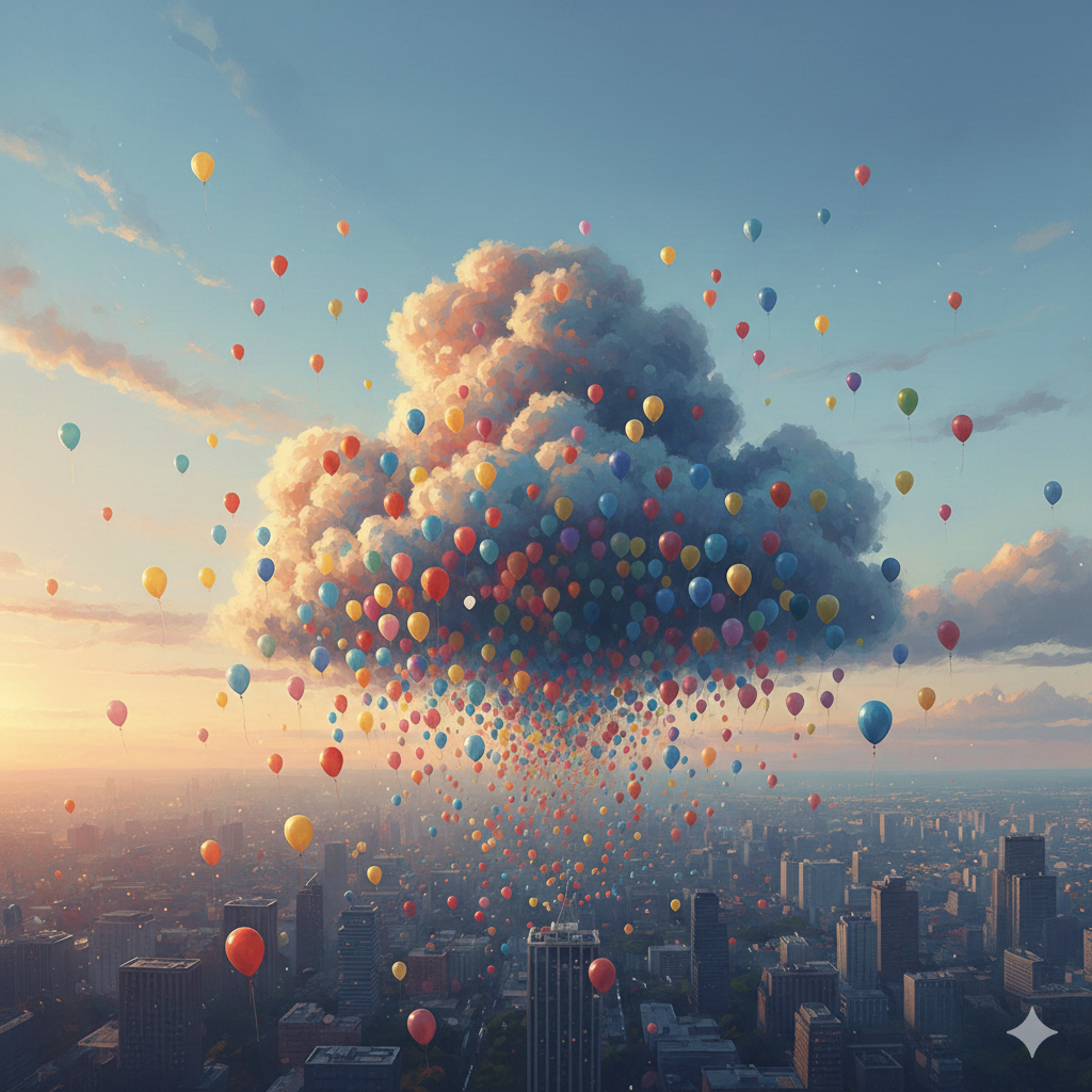 പെട്ടെന്ന്, ഒരു വലിയ കാറ്റിൽ ആ ഗോഡൗണിലെ ജനലുകൾ തുറന്നു. ആയിരക്കണക്കിന് ബലൂണുകൾ ആകാശത്തേക്ക് ഒരേസമയം പറന്നുയർന്നു. നഗരവാസികൾ അത്ഭുതത്തോടെ ആകാശത്തേക്ക് നോക്കി. ആകാശം മുഴുവൻ നിറങ്ങളാൽ നിറഞ്ഞു, പക്ഷേ ഓരോ നിറത്തിനുള്ളിലും ആ വലിയ ശൂന്യതയായിരുന്നു.